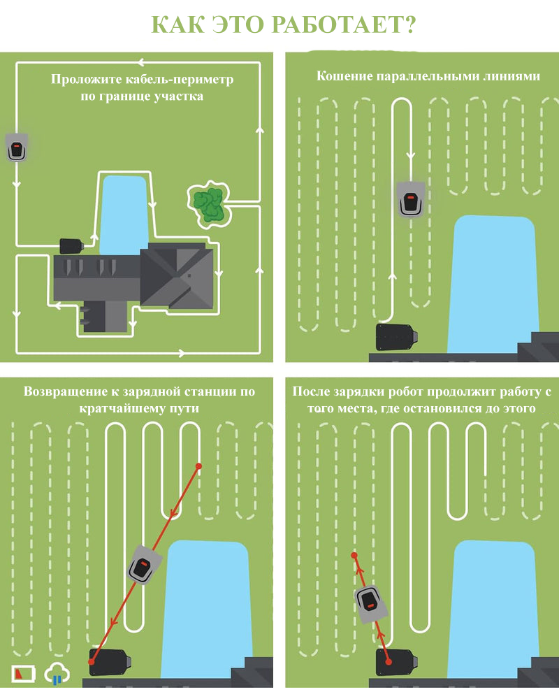 Уникальная запатентованная технология C-TOF позволяет роботу понимать где он находится относительно зарядной станции. Абсолютное большинство проводных роботов возвращаются на зарядную станцию по проводу периметру, уложенному в газон. Как правило, недорогие роботы оснащены слабыми аккумуляторами, которые быстро разряжаются и требуют частой подзарядки. Это приводит к тому, что робот вытаптывает газон и буквально накатывает колею вдоль кабель периметра. В модели ПИОН реализована функция умного возврата в случае разряда АКБ, начала дождя или внезапного происшествия робот из любой точки вашего участка вернется не по проводу, а по ближайшей траектории к зарядной станции.