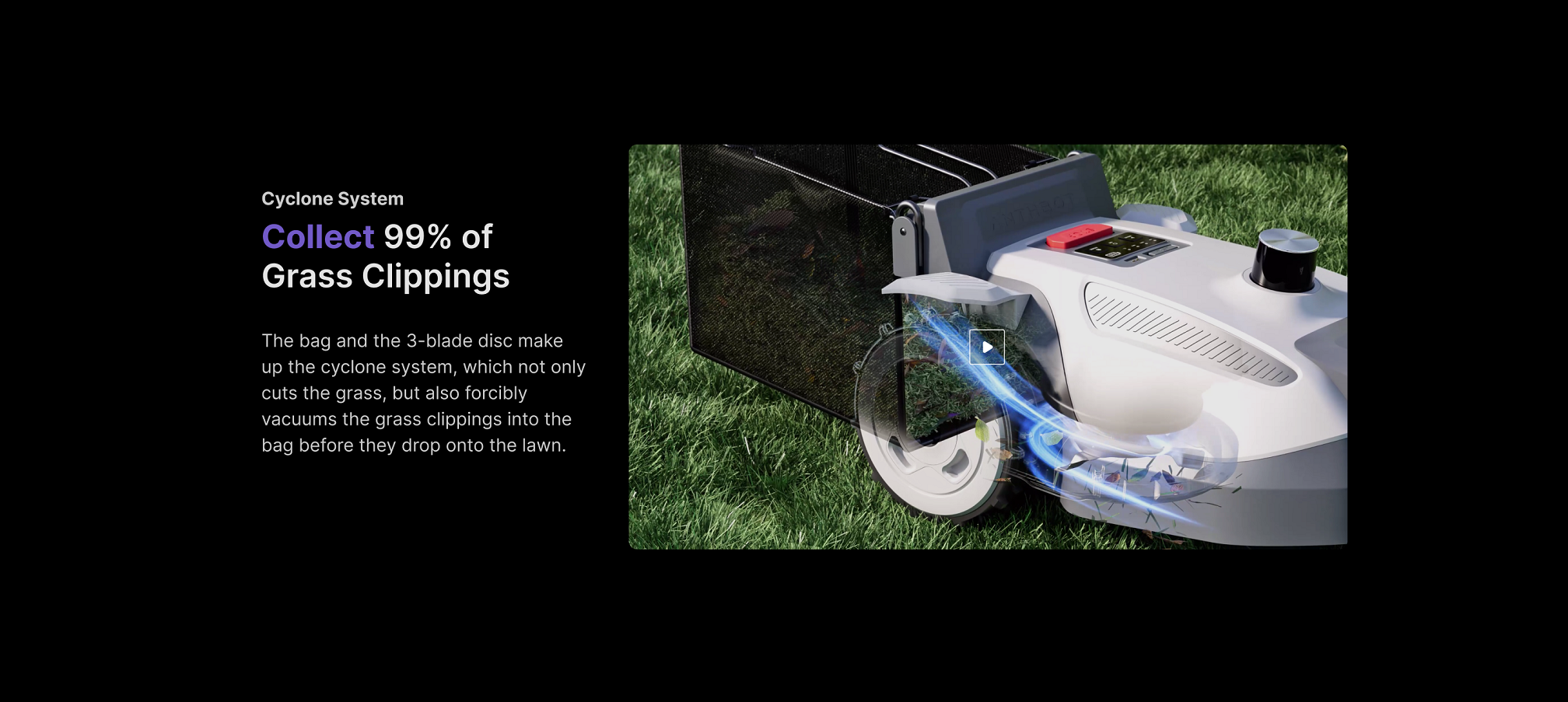 Робот оснащен высокоскоростным режущим диском c тремя лезвиями, который вращается со скоростью 4000 об/минуту. Благодаря специальной форме лезвий создается циклонный эффект и трава с листьями попадает в контейнер