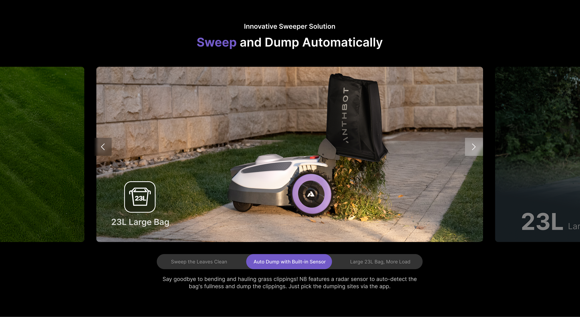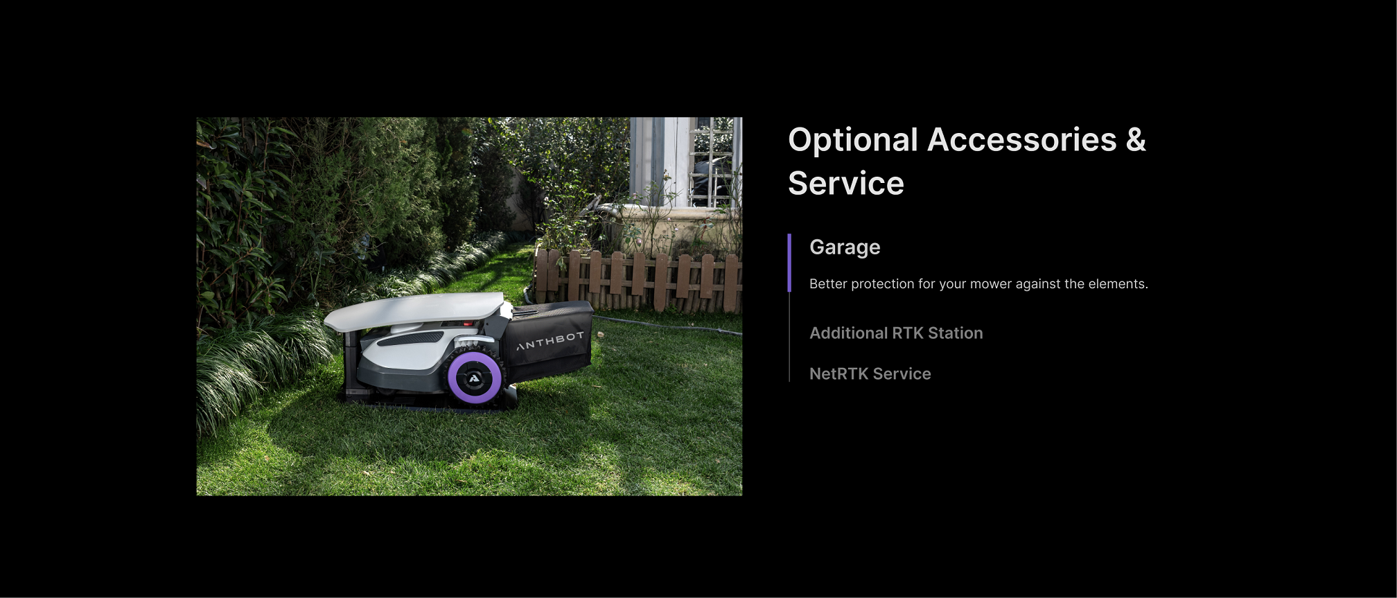 Всё это стало возможным благодаря уникальному сочетанию точной навигационной системы со станцией коррекции до 1 сантиметра, интеллектуальным алгоритмам перемещения по участку с двумя камерами и инновационному механизму автоматической очистки контейнера, что делает Anthbot идеальным выбором для сложных, насыщенных объектами садов, где важна абсолютная чистота после стрижки.
